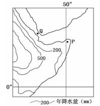 2、单选题 读某区域海陆轮廓及年降水量示意图。联系所学知识回答下列各题。