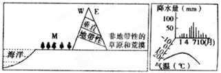 本题解析:1.根据M地的气候资料图可知该地是南半球的地中海气候,分布在30º--40 º之间大陆的西岸,沿岸受寒流的影响,降温减湿。 2.西侧处于迎风坡,降水丰富;东侧处于背风坡,降水稀少。导致自然带的垂直差异。选择D项。