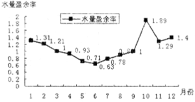 本题解析:此题不难,解题关键是是学生能够对新概念“水量盈余率”的理解,能够结合图中水库各月水量盈余率的变化判断库区降水量的变化规律。 小题1:根据水量盈余率=流入量/流出量,可知水量盈余率小于1说明水库水位降低,大于1则水库水位上升,所以该水库储水量最大的月份是水量盈余率开始小于1的3月份。 小题2:根据水量盈余率的季节变化,夏季水量盈余率小于1,说明降水量少,冬季水量盈余率大于1,说明降水量大,该水库库区冬季多雨,夏季少雨,所以该水库库区所处的自然带最有可能是地中海气候区的亚热带常绿硬叶林带。