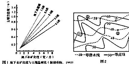 小题1:若地下水矿化度为5克/升,则图2中土壤含盐量大于等于0.8%的点有(?)