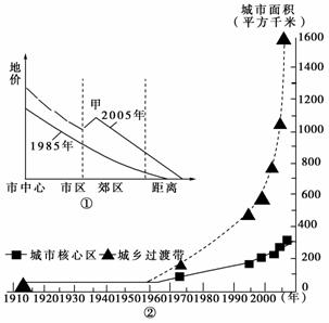 1.①图中甲处不可能建设2.①图中地价变化的原因和②图代表的国家分别是3.②图反映了该市