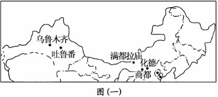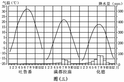 (1)三地纬度差别不太大,吐鲁番纬度略高,但气温却高于其他两地,其主要原因是_____________________________________。(2分)