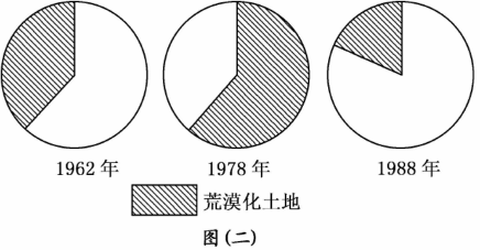 (3)读商都县西井子土地荒漠化状况图(二)回答20世纪六七十年代荒漠化的发展特点是________________,其主要原因是________________________________________________。八十年代后期与六七十年代相比,这些受荒漠化危害的农田面积发生的变化是________________,由这种变化使我们获得了值得借鉴的经验是____________________________________________。(6分)