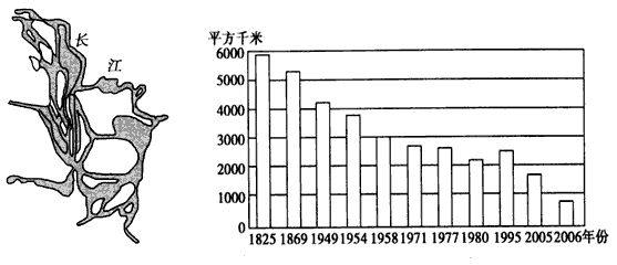 2、综合题 下图是20世纪80年代洞庭湖示意图以及洞庭湖1825~2006年间同水位湖面面积变化柱状图。读图回答下列问题。