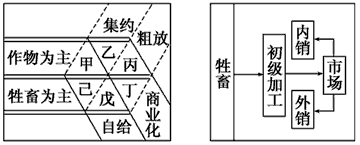 3、单选题 下面左图表示甲~己六种农业类型的经营特色,下图示意某种农业的活动模式。读图,完成1—2题。