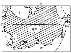 本题解析:本题考查世界区域地理。注意图示的经纬度分布,判断图示为北冰洋及周边地区,图示阴影部分表示海洋,空白部分表示陆地,(1)图示A表示连接太平洋与北冰洋之间的白令海峡。白令海峡为北美洲与亚洲的分界线。(2)图示B表示大西洋北部与北冰洋之间的格陵兰岛。为世界最大的岛屿,从成因上看,属于大陆岛。(3)图示C国为位于大西洋北部的岛国---冰岛,由于位于板块的生长边界,故多地热资源。(4)图示D为位于欧洲北部北冰洋沿岸的著名港口---摩尔曼斯克,由于受北大西洋暖流的影响,增温增湿,故终年不冻。