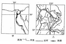 (2)甲图中的苏伊士运河,沟通了地中海与红海,缩短了大西洋沿岸与印度洋沿岸间的航程,是亚洲与非洲的分界线.乙图中的京杭大运河,历史上为我国重要的南北水上交通线,现在南段仍是重要水上交通线;如今,运河也是我国南水北调工程东线的输水通道。(12分)