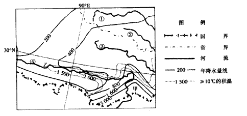 材料二:下图是我国青藏高原局部地区年降水量≥10℃的积温分布图。