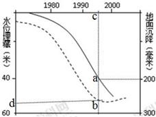 小题2:如下图所示。先找出地面沉降达到200毫米时的a点,可以读出该点的时间c约为1996年左右,再找出该时间对应的地下水水位b点,读出b点表示的地下水水位d点约为55米左右。A项最符合。