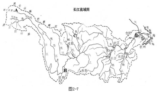 4、综合题 读图2-7“长江流域图”,回答下列问题。(13分)