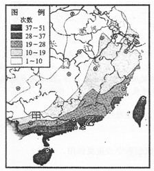 2、综合题  下图为我国东部影响严重的登陆台风次数(1949~2000年)分布图,读图回答下列问题