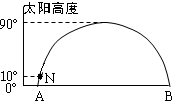 4、单选题  下图中纵轴表示太阳高度,AB为晨昏线,ANB为经线圈的一部分,其中N为北极点,经线NA为100°E,据此回答下列问题.