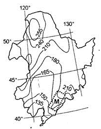 (1)读图,根据图中等雪期线在M地区向南,或向西南较低纬度凸出。判断M地区雪期长于其东西两侧,即M地区气温较低,地势较高,地形以山地为主。山区地势起伏较大,土层较薄,易发生水土流失,不宜发展种植业,有利于发展林业。所以农业类型为林业。