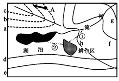 2、单选题 图中a、b、c线为等压线,箭头表示A地风向,d、e线为等温线,g、f、h线为