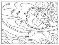 小题1:根据图示指向标,从a到b为由北向南的方向;河流流向与等高线凸出方向相反,故判断河流流向为从东北流向西南。