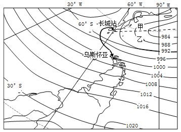 小题2:图中甲、乙两地在低压槽线附近,容易形成锋面,因为南半球低压系统空气呈顺时针方向运动,是乙地的空气向甲地运动,是暖气团向冷气团移动,甲乙两地都受暖锋天气的影响,甲地在暖锋的前面(冷气团的范围内)常形成阴雨天气。