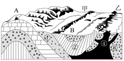 (l)图中地质构造是 __________,其中A为 ________ 斜,B为 __________ 斜。 (2)甲、乙两处山地的成因是 ________________________________________________。 (3)①、②、③、④四处的岩石属于沉积岩的是 __________ 和 __________ 。若要开采坚硬的岩石作建筑材料,宜选①处还是②处?__________ 处;若开采优质花岗岩作装饰材料宜选③处还是④处?__________ 处。 (4)A、B两处有一处为良好的储水构造,一处为良好的储油构造,其中A为 ______,B为 ________。 (5)任意采伐A处山区的森林,将会导致附近河流泥沙含量 ___________,水旱灾害增加,甚至可能造成 __________ 等地质灾害。 (6)我国黄土高原形成千沟万壑的地貌,主要原因是( )(多项选择题) A.黄土土质疏松 B.植被破坏严重 C.地面起伏明显 D.流水侵蚀严重