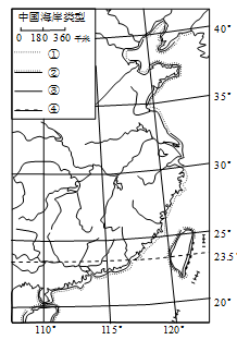 1.断层海岸,是地壳构造运动使海岸带的地表岩层发生巨大断裂时形成的。沿岸山势陡峭,崖壁高逾千米,水下岸坡极陡,海岸线平直而陡峭,大陆架狭窄。我国的台湾东部海岸就是断层海岸,图中符号是④,所以选项D对。图中①是生物海岸,主要分布在我国南部沿海和南海诸岛海岸,与断层无关,A错。②海岸主要分布在山东半岛、辽东半岛沿海,属于海浪侵蚀海岸,与不是断层海岸,B错。③海岸分布在我国的大河三角洲地区,大陆架宽阔,海水浅,海岸平直,属于沉积海岸, C错。