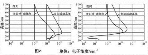 小题1:读下图,有关描述太阳活动与昼夜电离层电子浓度的高度分布特征正确的