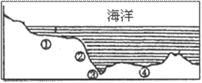 参考答案: (1)①大陆架?②大陆坡?③海沟?④洋盆 (2)波浪;潮汐;洋流;