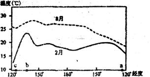 本题解析: 小题1:读图,根据经度判断,a海域位于太平洋东岸,2月和8月水温比大洋内部低,是因素沿岸有寒流经过,对沿岸气候降温减湿作用,不是有暖流流经,A错。b海域位于太平洋西岸,沿岸有暖流经过,水温温深受暖流影响,所以其海平面等温线向高纬凸出,B对。c海域2月份水温低,是受冬季风吹动形成的沿岸流影响,底层冷海水上泛的结果,所以冬夏季节水温差异大,不是河川渗流影响,C错。因受太阳直射点季节移动的影响,2、8月水温差异大,D错。 小题2:据图推断,该海域8月份水温高,所以该纬线位于北半球,C、D错。8月份水温约为25°C,冬季2月份水温约20°C左右,最低温度大于0°C,说明没有结冰期,所以不会是60°N,A错。该纬线可能是30°N,B对。
