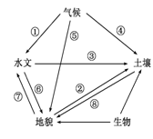 A.⑤ B.⑥ C.⑦ D.⑧ 参考答案: 本题解析:本题考查自然环境的整体性。 本题难度:一般 3、单选题 下图示意北半球某森林带分布上限海拔高度与经纬度的关系。据图回答下题。 参考答案:1. D 本题解析:1.试题分析:分析该森林带水平分布特点可知,该森林为亚寒带针叶林。图示为北半球某森林带分布上限海拔高度与经纬度的关系,并未显示南半球,A项错误。赌徒易于看出该森林带分布的最北界线纬度高于60°N,B项错误。低纬度地区该森林带分布海拔较高,但并不高于5000米,C项错误。分析图示可知从低纬到高纬该森林带分布上限呈递减趋势,故D为正确选项。 本题难度:简单 4、单选题 读图,回答下列各题。 参考答案:1. B 本题解析:本题考查我国的区域地理。 本题难度:一般 5、单选题 从陆地环境的整体性分析,下列地理现象与当地自然环境特征相符的是 [? ] A.青藏地区地势较高,年均气温较低 B.南方地区雨热同期,植被多为针阔叶混交林 C.北方地区河流较少,多为季节性河流 D.西北地区以酸性土壤为主,肥力较低 参考答案:A 本题解析: 本题难度:简单 |