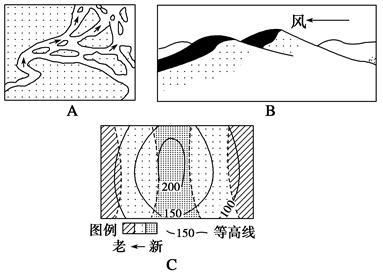 小题1:A图表示的是在?作用下形成的?地貌。(2分) 小题2:B图是?地貌,往往形成于?地区;近年由于人类?等不合理的活动,造成B图中的景观出现不断蔓延、扩大的趋势。治理这种危害应采取的措施为?。(6分) 小题3:根据等高线数值判断,C图中地形是五种基本类型中的?,判断理由?;图上的地质构造是?,判断理由是?;此处地形的形成原因是?。(7分)