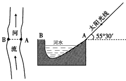 【小题2】如果河流的流向为由东向西,则太阳光线是从河流的北面照射过来的,此时该地太阳高度角为55°30′,根据正午太阳高度计算公式可知,该地地理纬度为54°30′S。