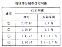 5、单选题 城市用地紧张,因此不少楼盘为了“有效”利用土地,随意缩短了楼间距,降低了居室的日照标准,关于居民呼吁“阳光权”的新闻屡见不鲜。城市住宅小区规划时,对采光条件有明确的规定,下表反映了我国部分城市住宅在满足日照条件下的楼间距的要求(表中H为住宅楼高度,适用于住宅呈南北走向的平原地区),回答下列各小题。