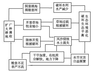 A、少雨年份加大农田比例B、粗放经营C、脆弱的生态环境D、沙丘开垦E、风蚀、水蚀加速F、土地肥力下降