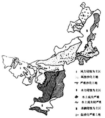 材料二:晋陕内蒙古地区土地退化类型与分布图。
