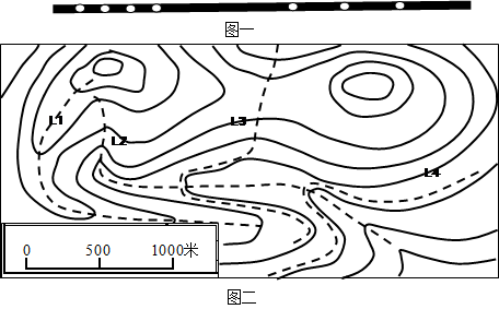 2、单选题  某运动员在自行车上安装全球定位系统(GPS),并用每1分钟自动记录一点的方式,将骑自行车所到之处记录下来。下图一为该运动员在山区公路上全力冲刺时GPS的点位记录,判断图二等高线中符合运动员行进线路的是