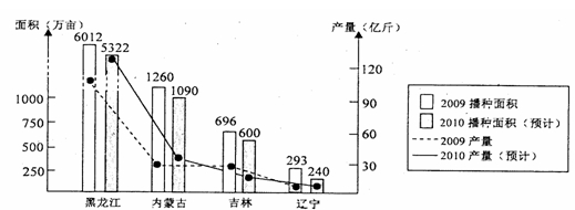 3、单选题  东北是我国大豆的主产区,但近几年的播种面积和产量都不稳定,图为2009-2010年四省区大豆种收情况统计图,读图完成下列各题。