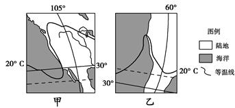 (1)根据图中经纬度和海陆轮廓可判断出,甲图中陆地为北美洲局部,乙图中陆地为南美洲局部。甲、乙两图中陆地等温线都向高纬凸出,因此图中所示地区都处于夏季。