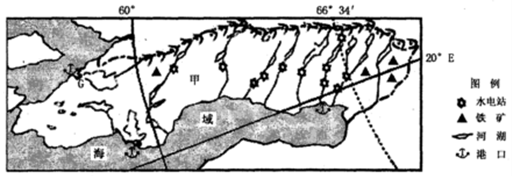 (2)图中甲国是挪威,有丰富的铁矿资源。境内多河流湖泊,水资源丰富。河流落差大,水力资源丰富。该国是发达国家,工业发达,技术先进。海岸线曲折,多海港,海运便利,国际市场广阔。有利于钢铁工业发展。