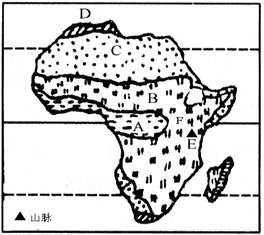 本题解析:本题考查非洲的气候。(1)由于赤道横穿非洲中部,故非洲的气候和自然带都以赤道为中心,南北对称分布。结合图示自然带大体呈南北方向更替,故反映了自然环境的纬度地带性规律,以热量条件为基础。(2)图示A分布于刚果盆地,受热带雨林气候影响,形成热带雨林带。F为东非高原,由于地势高,故气温较低,对流运动弱,降水较少,而形成热带草原气候。(3)山脉E位于赤道附近,纬度低,且相对高度大,故自然带数目多。(4)图示非洲西南部的沙漠由于受沿岸寒流影响,故呈南北狭长分布。