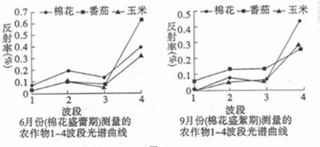 ①水文地质?②城市规划 ?③交通线路?④农作物分布 A.①② B.①③ C.②③ D.②④ 5、单选题 棉花遥感识别是棉花种植面积遥感估算的关键,下图是我国某地区不同日期棉花光谱信息与其他作物光谱信息的曲线分析图。图中前三个波段为可见光波段(分别为蓝波段、绿波段、红波段),第四波段为近红外波段。读图回答下面问题。 |