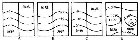 2、单选题 三幅等温线图和一幅等压线图,表示北半球7月份的是:(? )
