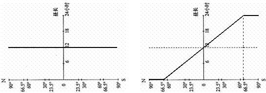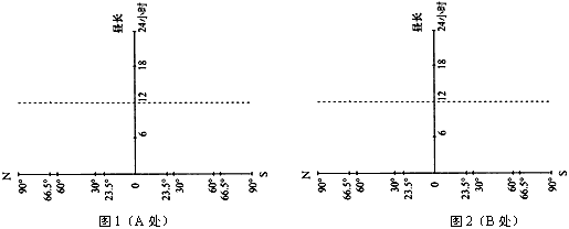(4)请在下列图1、2中分别用实线直线画出表示地球位于上图中A、B处的全球昼夜分布情况。