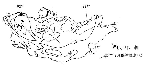 点评:试题难度中等,解题关键是理解等温线的分布规律与区域降水的原因。根据图中的等值线分布判断①为低值中心,气温应低于12°C。另外我们还可根据图示的经纬度和轮廓判断,此国位于中国的北部,且为内陆国,可推出是蒙古国,即是温带大陆性气候,蒙古深居内陆,降水少,形成的自然带是温带荒漠带。
