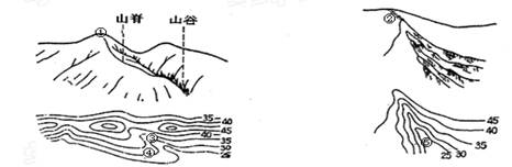 小题2:根据等高线,图中B、D河流流向错误,图C等高线弯曲处是山脊,该处是分水岭。