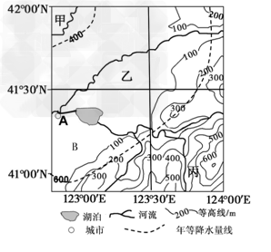 4、综合题  下图为“我国东部某地区地形等高线及年等降水量线图”。读图回答下列各题。