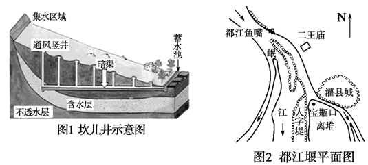 (2)坎儿井采用地下暗渠输水,受季节、风沙影响较小,(2分)可减少水分蒸发,使流量稳定,(2分)提高了干旱地区水资源的利用效率。(2分)都江堰是合理利用地形坡度,确保常年自流灌溉,(2分)科学分流,减轻水旱灾害。(2分)