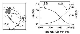 (2)据报道,1960年以来,图中湖泊的面积、水量、水面高度均在减少,而湖水盐度开始接近海水盐度,原始有机体大量死亡。试说明其原因。(6分)