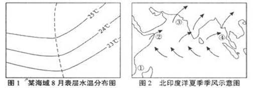 小题1:读图1判断,该海域位于?半球;该洋流(虚线所示)流经海区水温比同纬度附近海区水温?。按照寒、暖流的分类,该洋流是?流,它对沿岸气候能够起到?、?的作用。(4分) 小题2:图1虚线所示的洋流朝?(方向)流动。在图2所示的①、②、③、④四海区中,图1表示的海域可能出现在?海区。(2分) 小题3:解释北印度洋西南季风形成的原因,并按时针方向说明夏季北印度洋季风洋流流动的方向。(2分) 小题4:为什么在有些大陆沿岸海区会发生涌升流现象?在图2所示①、②、③、④四海区中最可能出现涌升流的是哪一海区? (2分)