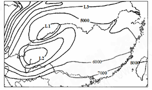 【小题1】根据图中等值线的分布,L1中心区的值可能为大于6000小于7000,L2的中心值可能为大于2000小于3000,两者之间的差值为大于3000小于5000。所以本题选择D选项。