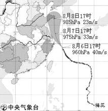 5、单选题 据中央气象台监测显示,2011年第九号台风“梅花”8月6日17时中心位于浙江省舟山市东偏南方向大约285公里的海面上,中心附近最大风力有13级(40米/秒),中心最低气压为960百帕,七级风圈半径约280公里。但“梅花”与上海擦肩而过,网友调侃“梅超风”变成了“梅干菜”。