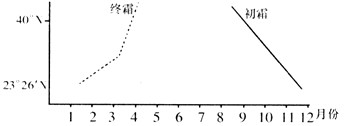 4、单选题 我国某中学地理研究性学习小组对霜冻现象进行探究性学习。下图是通过长期收听天气预报绘制的我国东部地区的平均初霜、终霜日期曲线图。据此回答1~2题。