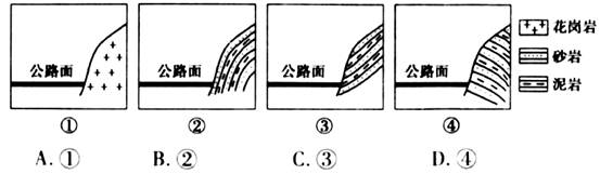 2、单选题 下图是某高速公路沿线四处道路地质剖面图,其中易发生滑坡的是(? )