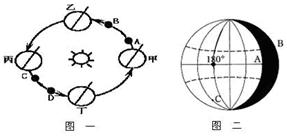 ⑵图一中ABCD四处中地球公转速度最快的是______处,此时的日期为____________。